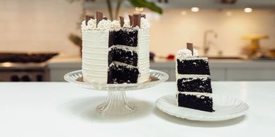 Ultra moist banana cake filled with a vanilla cream filling & thinly sliced banana. Covered in vanilla cream, crushed golden Oreos and vanilla wafers.